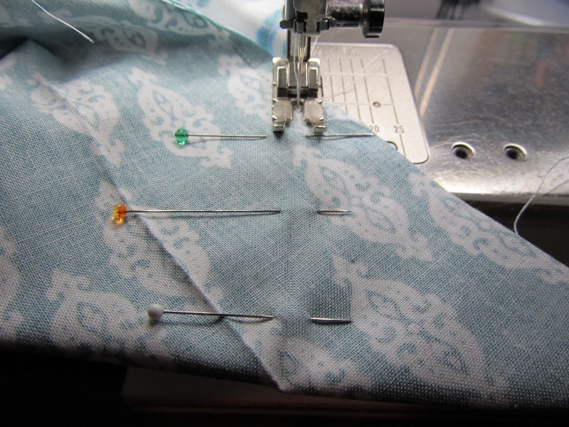| Re-pin across the fold. If you can't see the fold to sew on use a fabric pen or pencil to darken the line. |